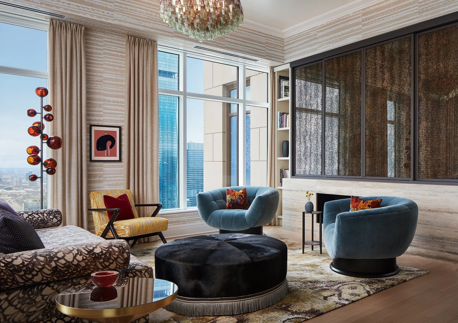 Affectionately dubbed ‘Condo in The Clouds,’ our clients wanted a low-maintenance lifestyle in the heart of the city that would be welcoming to their family and provide lots of opportunities for entertaining. Perched on a high floor in the Robert A.M. Stern-designed One Bennett Park, the residence features commanding vistas of Chicago and Lake Michigan. With the lake set as the focal point for each room, the home’s color palette and design aesthetic fell into place. Echoing both the lake and city views beyond, the residence is filled with custom-designed functional pieces, luxuriously upholstered furniture, meaningful art, and plenty of space to entertain and appreciate the view.