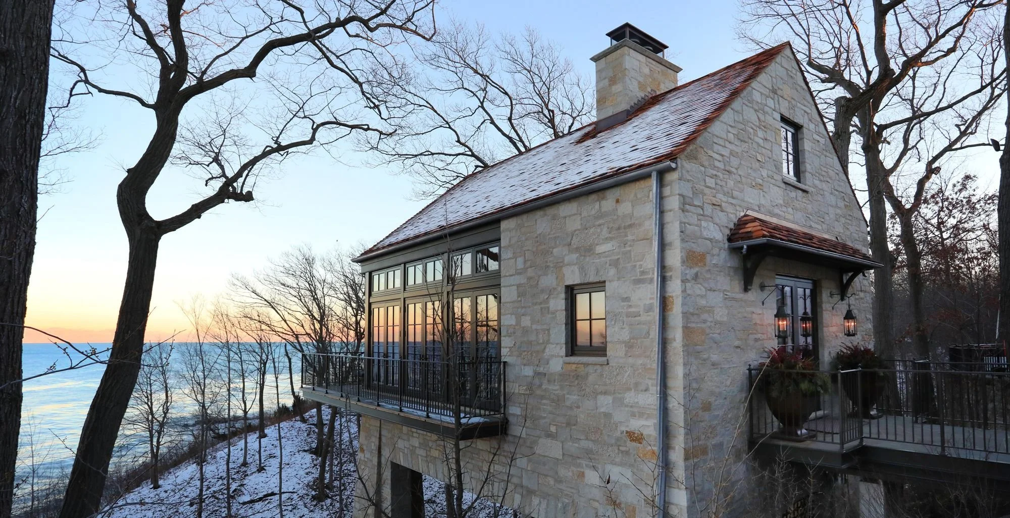 The interior is simple: one story, with a foyer, a seating area and a wet bar. Walls of windows offer sweeping lake views. Doors that open on three sides lead to a wraparound balcony. There are no bedrooms or bathrooms. Those amenities are shared with the main house, purchased in 2002 for $3.58 million, which has eight bedrooms and 7½ bathrooms.